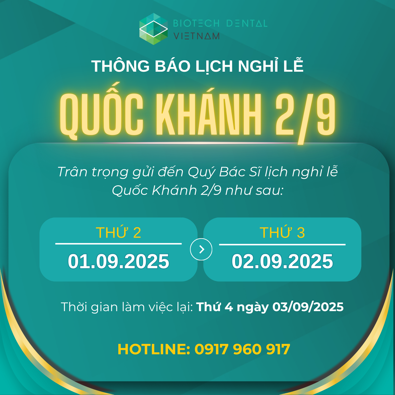 Công ty TNHH NIDP Biotech Dental Vietnam xin trân trọng thông báo đến Quý Đối tác, Quý Bác sĩ về lịch nghỉ lễ Quốc khánh 2/9 năm 2025 như sau: